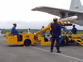 | ハープーンミサイルを持ち上げるフォークリフト |